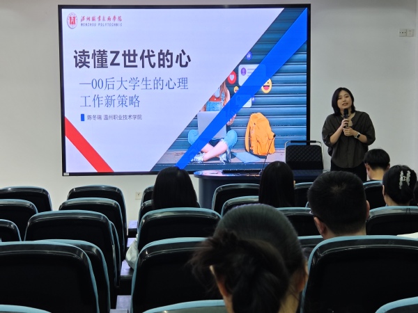 为进一步提升学工队伍心理育人能力,5月21日下午,学工部组织开展了班主任、辅导员心理健康教育专题培训。本次培训邀请了温州职业技术学院学工部副部长、国家二级心理咨询师陈冬瑞担任主讲嘉宾,由学工部副部长裘俊主持,全体班主任和辅导员参加。