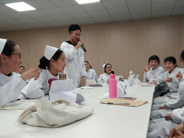 课堂上,同学们围绕“如何成为一名合格护士”主题展开深入讨论,并通过多种形式积极发言、各抒己见。深情饱满的诗歌朗诵《你的名字--护士》,提升了学生们的职业感知度;一段真实的医护纪录片《人间世》,强化了学生们救死扶伤的担当;余音绕梁的歌唱表演《天使的爱》,表达了同学们对人文关怀的感悟。