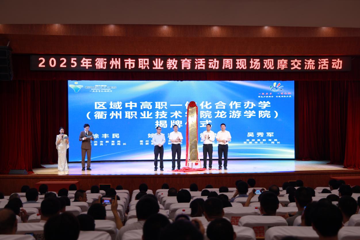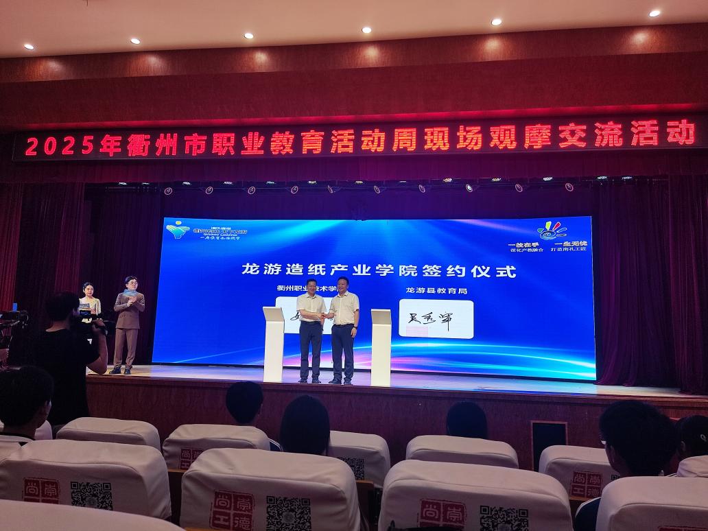 5月20日,衢州市职业教育活动周系列活动在龙游县隆重举行。校党委委员、副校长姚水洪率队参加。活动主会场,实施区域中高职一体化办学的衢州职业技术学院龙游学院揭牌成立。学校与龙游县人民政府签署了《共建龙游造纸产业学院战略合作协议》,标志着校地合作在产教融合领域迈出关键一步,为区域中高职一体化人才培养改革注入新动能。
