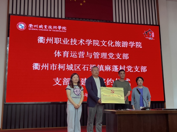 在签约仪式上,体育运营与管理党支部书记陈力全与石梁镇麻蓬村党支部书记傅建军分别代表双方签署党建联建协议,校党委委员、组织部长周帅授牌,标志着校地双方正式“牵手”,开启深度合作新征程。