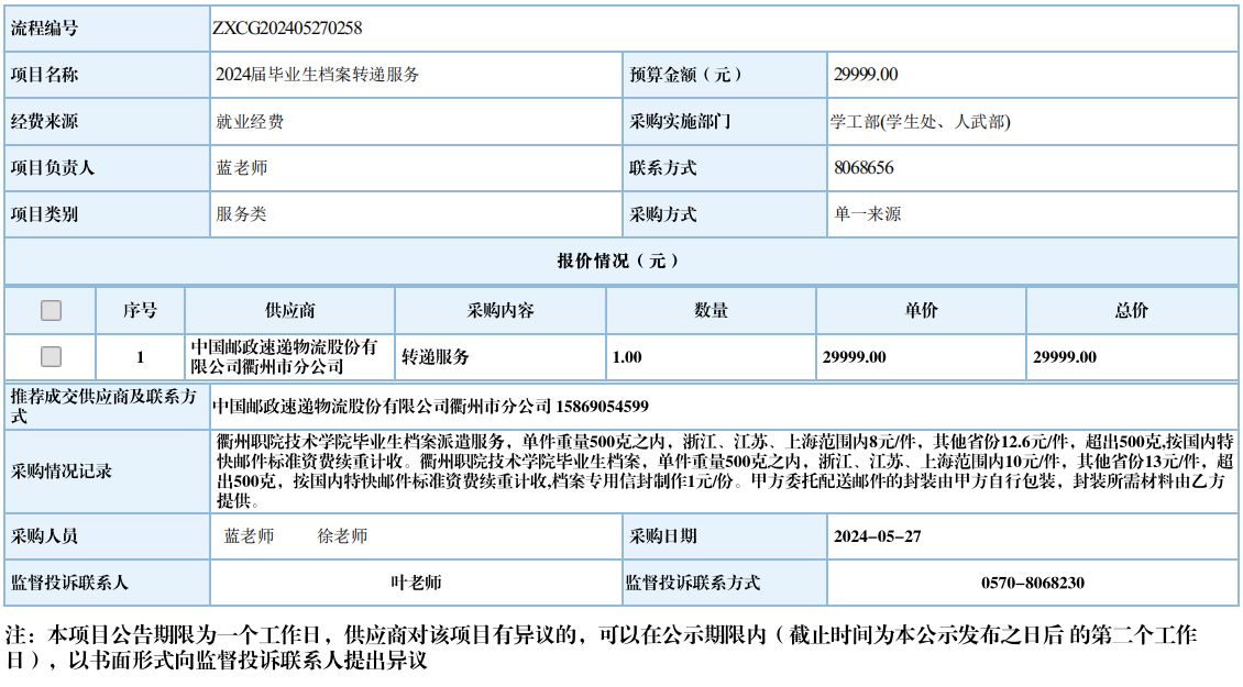 衢州职业技术学院2024届毕业生档案传递服务自行采购信息公示