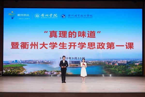 9月23日晚,“真理的味道”暨衢州大学生开学思政第一课在衢州学院训研创报告厅热烈开讲。衢州学院、衢州职业技术学院的“00后”新时代理论宣讲团成员轮番登场,以生动讲述、鲜活案例,为500余名师生带来一场有温度、有力量的“思政课”。衢州学院党委副书记吴耀光、衢州学院党委委员、宣传部部长毛薇以及我校党委副书记何百通、我校党委委员、宣传部部长孔庆红和500余名师生一起参加活动。