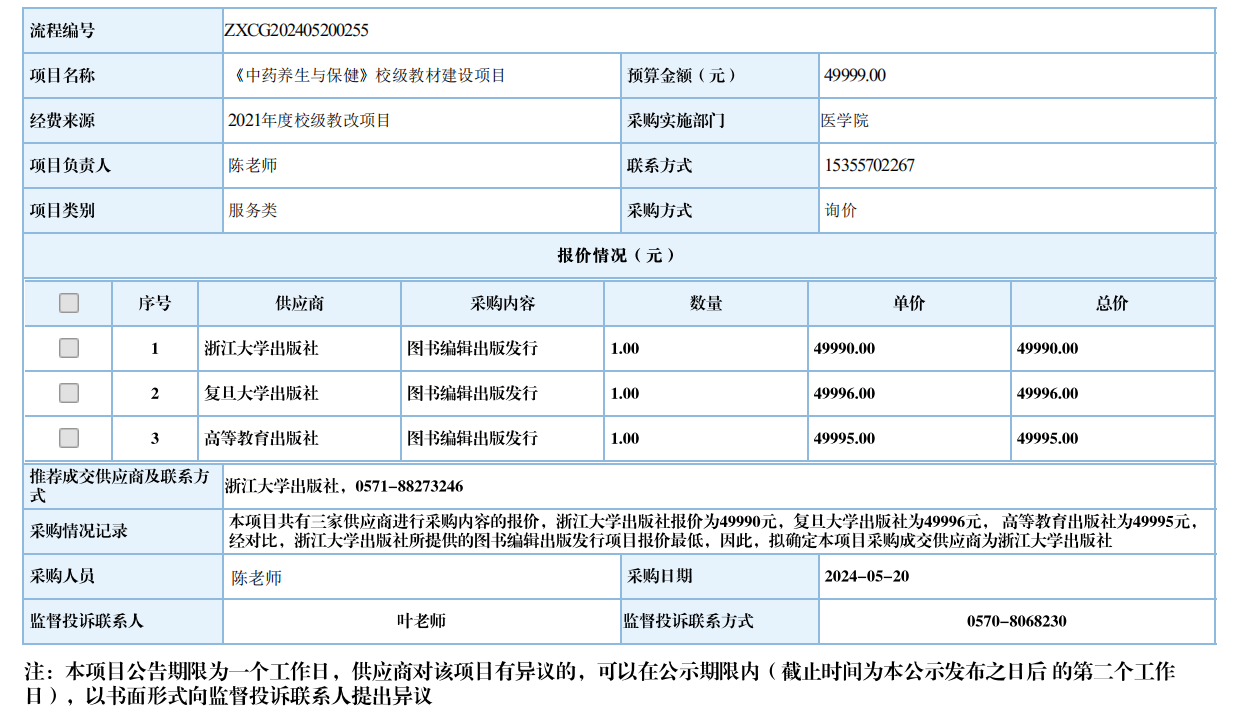 衢州职业技术学院《中药养生与保健》校级教材建设项目自行采购信息公示