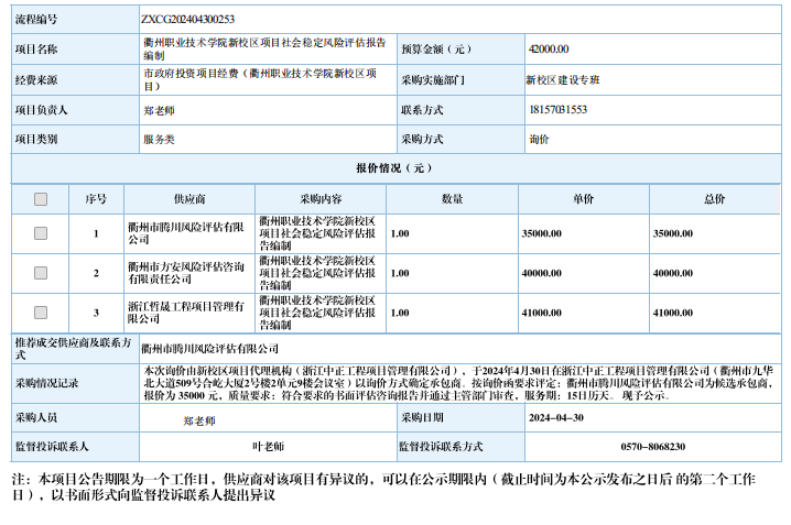 衢州职业技术学院新校区项目社会稳定风险评估报告编制自行采购信息公示
