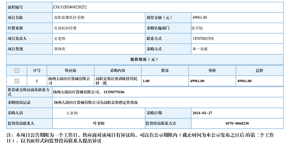 衢州职业技术学院高职竞赛耗材采购自行采购信息公示