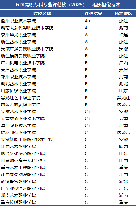 近日,全国GDI高职专科专业评估榜正式发布,我校摄影摄像技术专业凭借突出的综合实力,在评估中获A+等级(唯一A+等级专业),荣登该专业全国榜首,标志着我校该专业建设水平跻身全国高职专科同类专业顶尖行列。