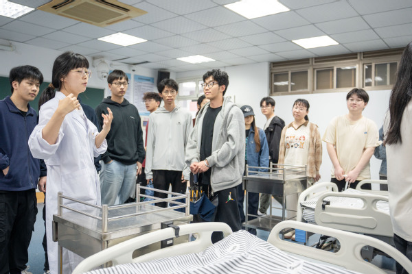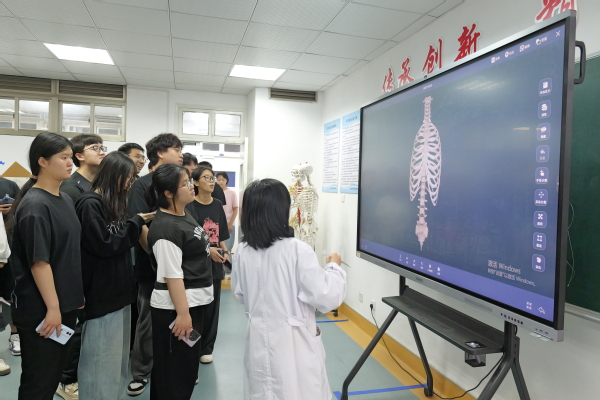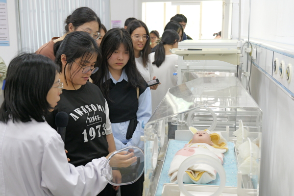 在医学院,党员教师通过“医”心为民党建文化走廊及人体形态3D解剖、母婴护理仿生、急救虚拟仿真等特色实训室的设备介绍、实操演示,向发展对象展示医学数字化教学优势;通过参观母婴护理区的智能分娩模拟舱、新生儿照护实训场景,感受学校助力“一老一小” 照护的专业优势,让发展对象深切体会到医学院“南孔仁心”的育人特色。