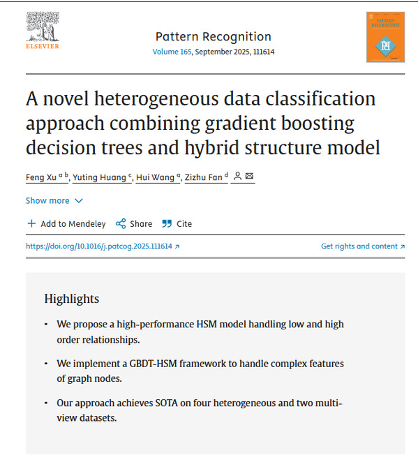 徐峰老师发表的论文题目为 “A novel heterogeneous data classification approach combining gradient boosting decision trees and hybrid structure model”(《一种结合梯度提升决策树与混合结构模型的异构数据分类新方法》)。论文聚焦异构数据分类这一关键技术难题,创新性提出融合梯度提升决策树(GBDT)与混合结构模型(HSM)的解决方法。经实验验证,该方法在多个数据集上展现出优异性能,在异构数据分类任务中达到国际先进水平,为相关领域的技术突破提供了重要参考。