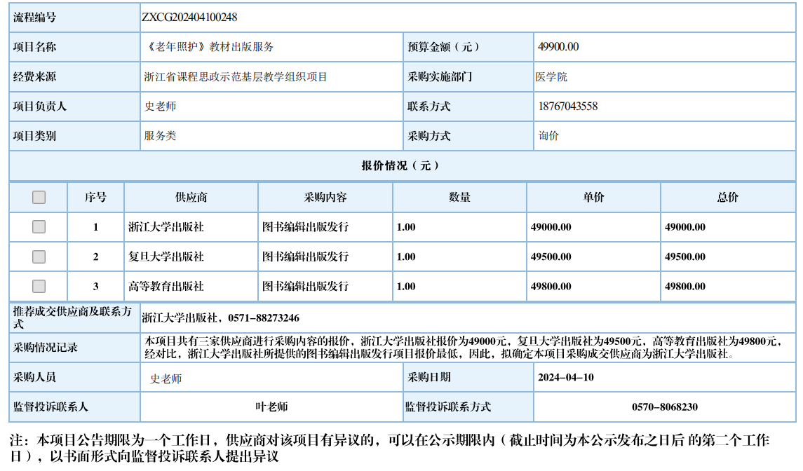衢州职业技术学院《老年照护》教材出版服务自行采购信息公示