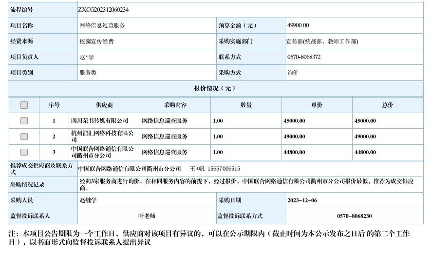 衢州职业技术学院网络信息巡查服务自行采购信息公示