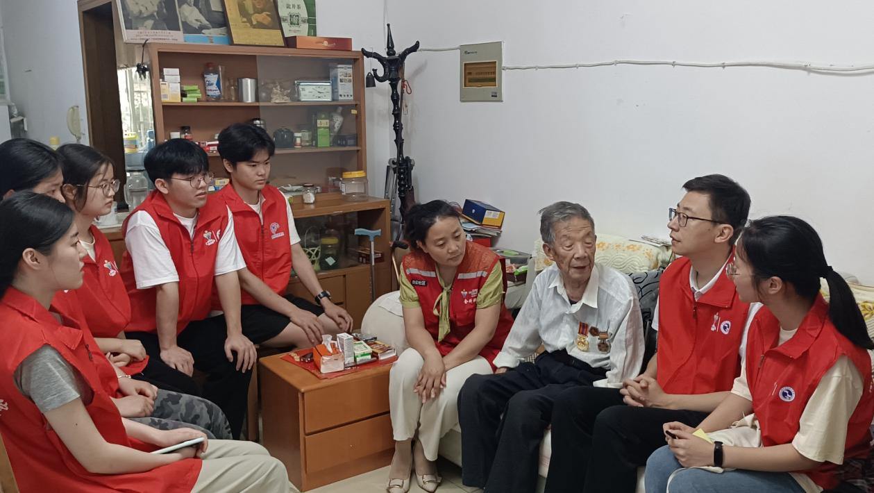 实践环节中,由蒋薇和校团委马超老师带领的学生团队,带着鲜花和慰问品走进白云小区老兵家中。当青年们询问坚守阵地的信念时,97岁的抗美援朝老兵魏绪先轻拍胸前的军功章:“当年我们守国土,如今你们守生态,都是为子孙谋幸福!“在越南自卫反击战老兵胡坤前家中,斑驳的军用水壶、褪色的行军包,让“青助夕阳”志愿服务更添历史厚重感。