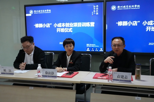 为提升在校大学生的职业素养和就业竞争力,帮助学生们掌握小成本创业所需的专业技能,推动他们在未来的创业和就业路上迈出坚实的步伐,3月28日下午,我校和衢州市人社局联合举办的衢州职业技术学院“修颜小店”小成本创业训练营开班仪式在图书馆311举行,衢州市人力社保局党委委员、市人才和就业管理中心主任袁建志和衢州职业技术学院党委委员、副校长徐浪静等领导和师生代表四十余人参加了开班仪式。