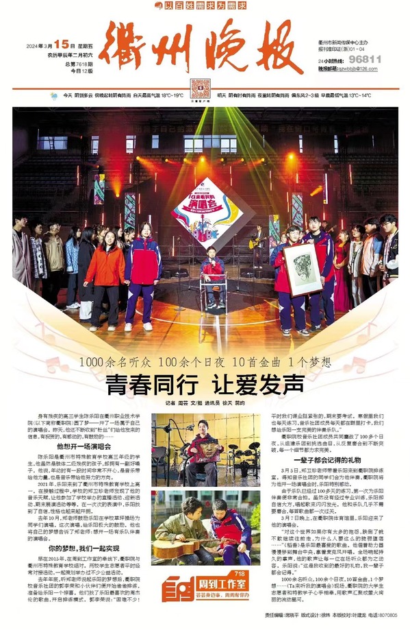身有残疾的高三学生陈乐阳在衢州职业技术学院(以下简称衢职院)圆了梦——开了一场属于自己的演唱会。昨天,他还不断收到“粉丝”们给他发来的信息,有祝贺的,有感动的,有鼓励的……