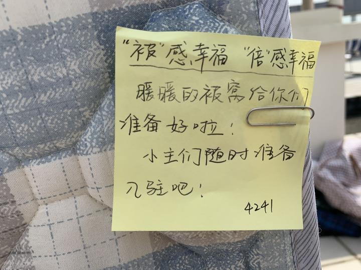 “暖暖的被窝给你们准备好啦,小主们随时入驻吧!”写下对联系寝室同学们的暖心话语,衢州职业技术学院经济管理学院的姚春老师小心翼翼地将便笺纸别在对应床铺的棉被上,然后一趟趟地往返寝室和楼顶的晾晒场地,搬运被子、抱枕、玩偶,铺开、拍打、整理......