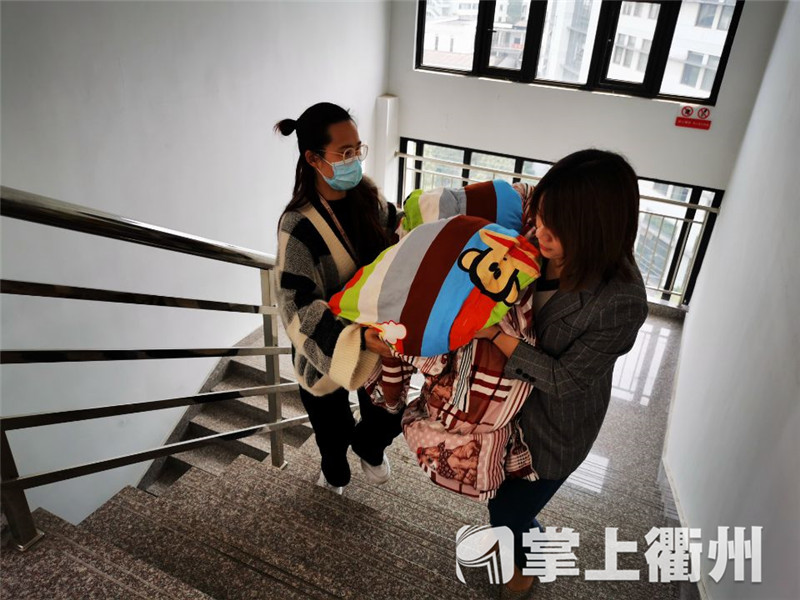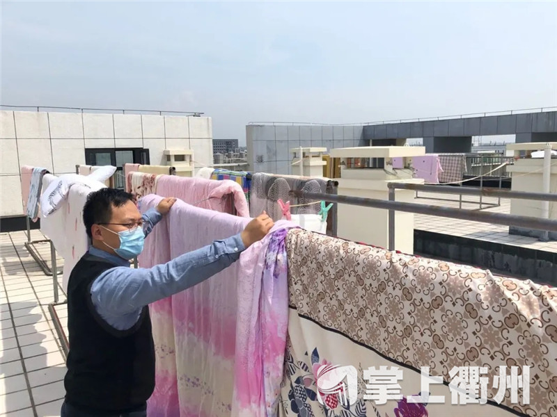 担当搬运和晾晒被子主力的是衢职院的老师们。“差不多全体出动,每个老师对口负责两到三个宿舍,根据学生们报名的意愿来。”学工部一位老师告诉记者,今天晒的是大二同学们的被子,上百位老师一共晒了近1000条,过几天还要晒其他年级的被子。