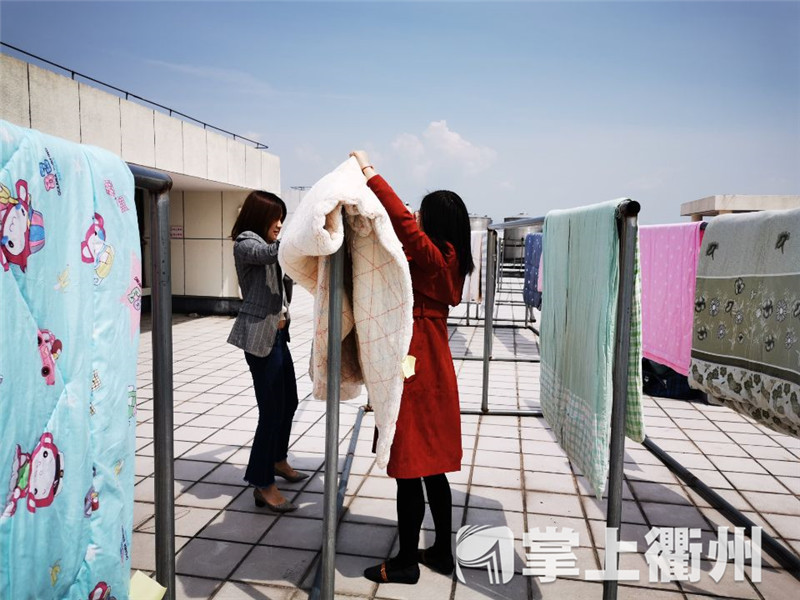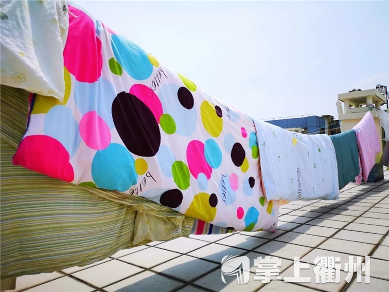 太阳当空照,晾晒正当时!今天上午10点半,衢州职业技术学院宿舍楼顶一片片花花绿绿,蔚为壮观,来自几百个宿舍的近千床被子被仔细摊开,散去一个冬天的潮气,迎接阳光的洗礼。