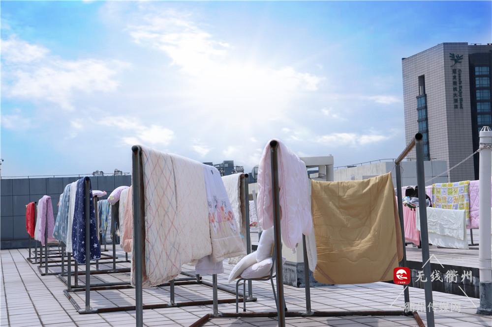 今天,暂未开学的衢州职业技术学院宿舍楼顶晒满了被褥,成为一道独特的风景线。
