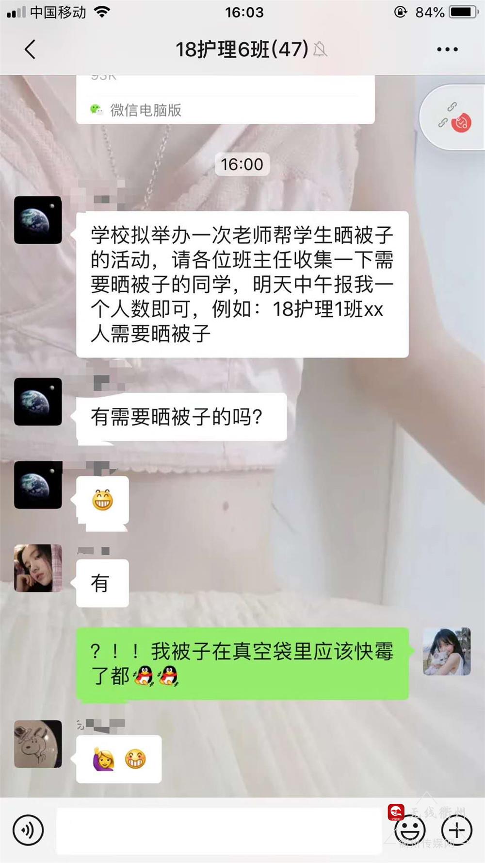 此前,学校各位班主任,通过微信、QQ群等多种渠道询问学生是否有晒被褥的需求,得到众多学生回应:“要的!被子这么久没用过,好担心发霉了!”