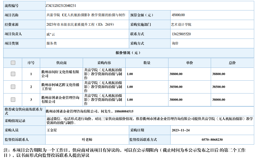 衢州职业技术学院共富学院《无人机航拍摄影》教学资源的拍摄与制作自行采购信息公示