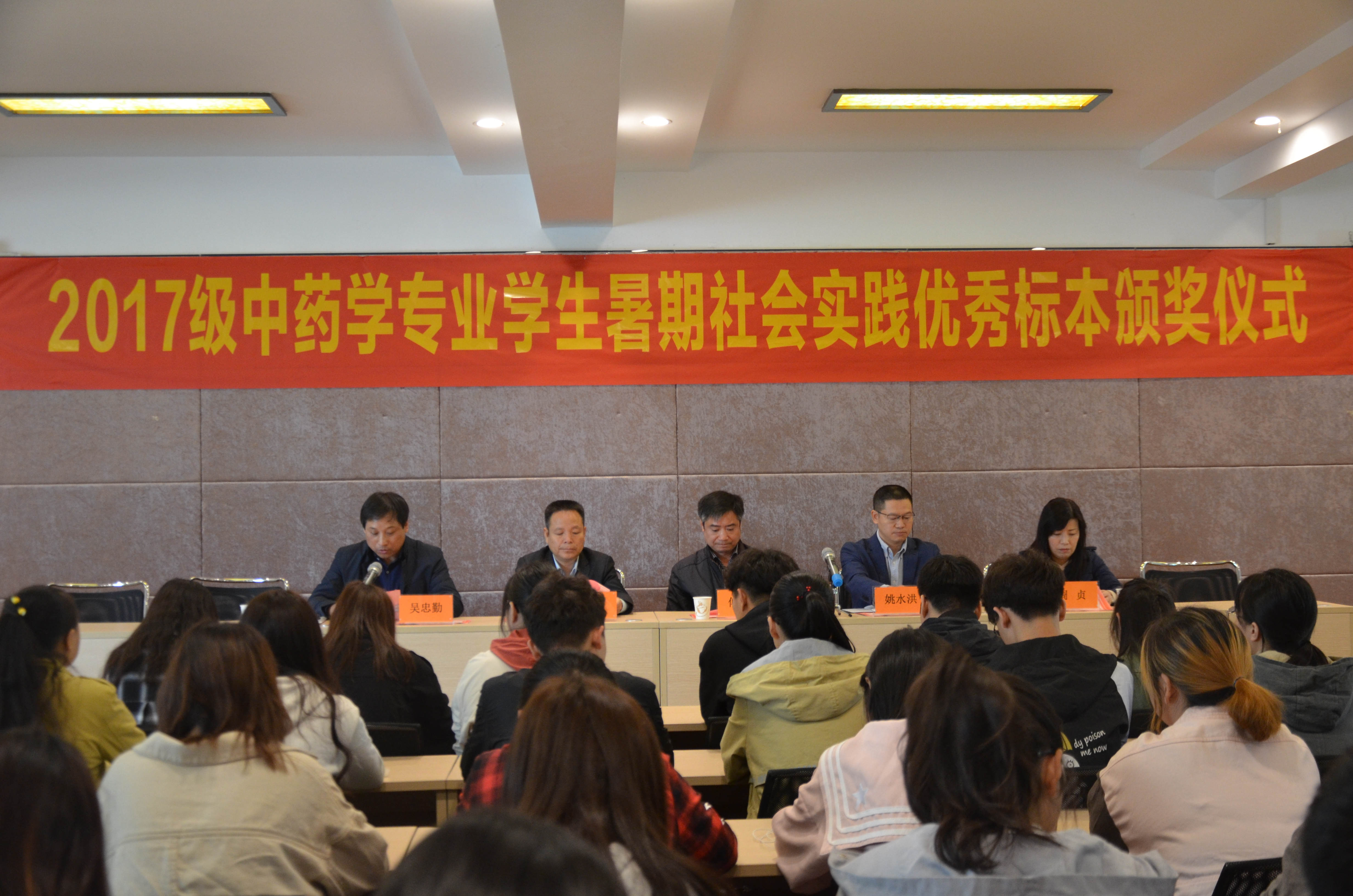 为表彰和展示17级中药学专业学生暑期社会实践成果,医学院于10月24日上午,在医学实训多功能厅举行17级中药学专业学生暑期社会实践优秀标本制作颁奖仪式。副校长傅元勋、医学院院长姚水洪、党总支书记余文富、副书记周贞、副院长吴忠勤和中药学专业团队参加了本次颁奖仪式。仪式由吴忠勤主持。