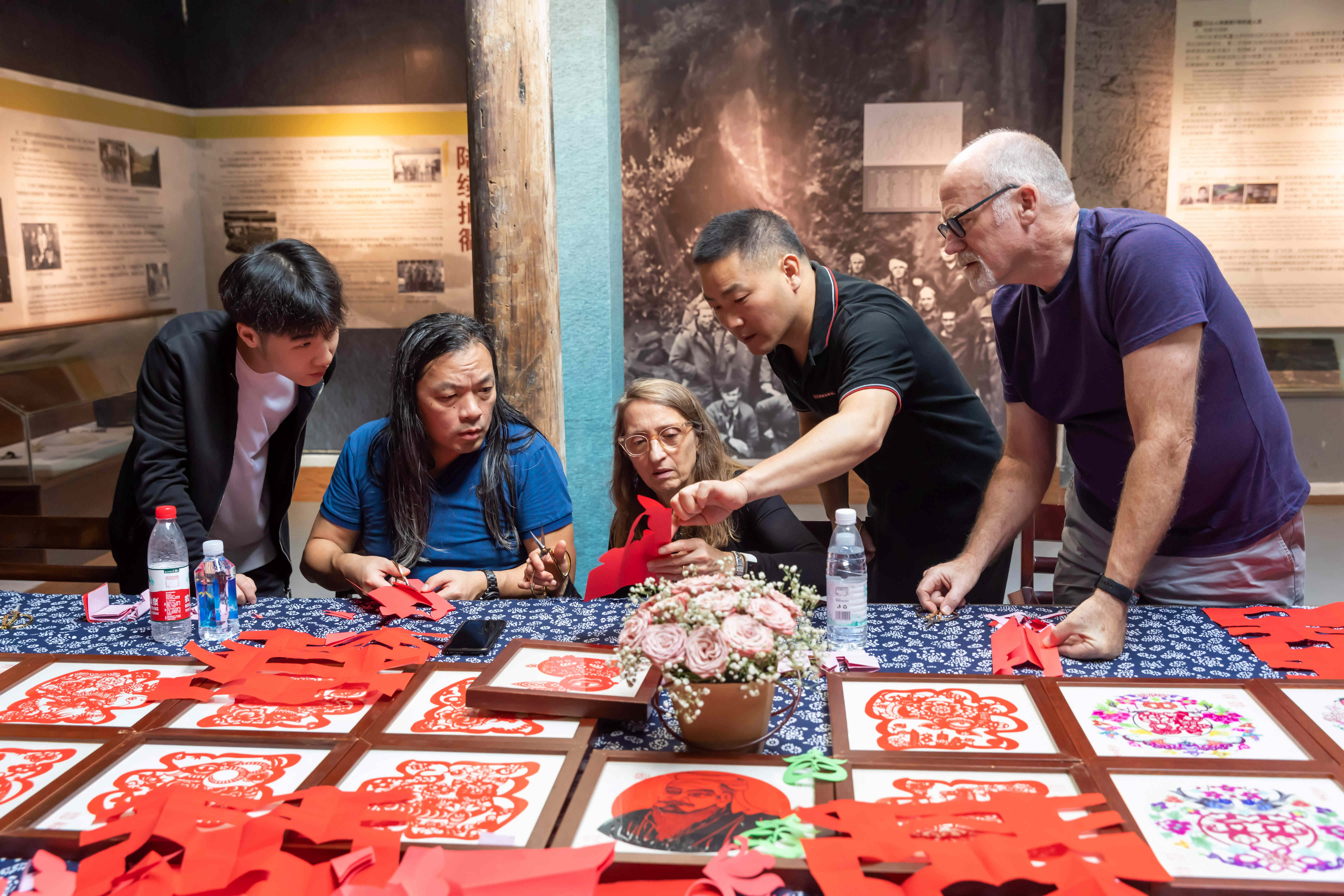 雷柯华(中)和丈夫(右一)等人学习中国剪纸技艺。