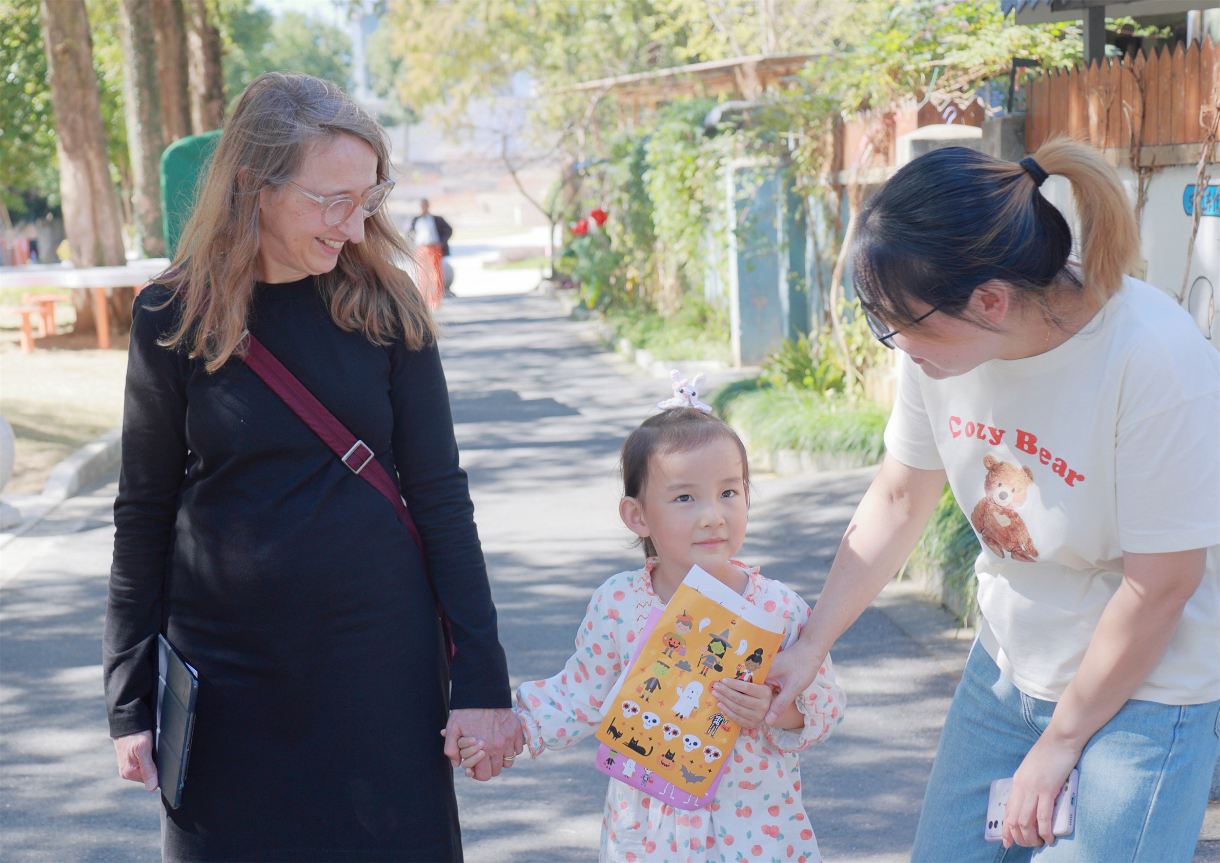 11月1日,在龙游溪口未来乡村,雷柯华牵手当地孩子感受新农村变化。