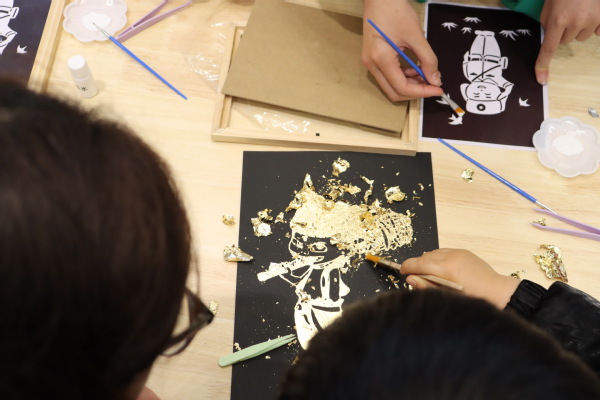 活动尾声,志愿者化身“非遗小老师”,指导孩子们用染色竹篾编织雷锋主题画作,以镊子轻贴金箔勾勒“雷锋助人”“哪吒踏火”的创意图案。竹篾交错间传承奉献情怀,金箔闪耀中点亮童心梦想,传统技艺与时代精神碰撞出别样火花。