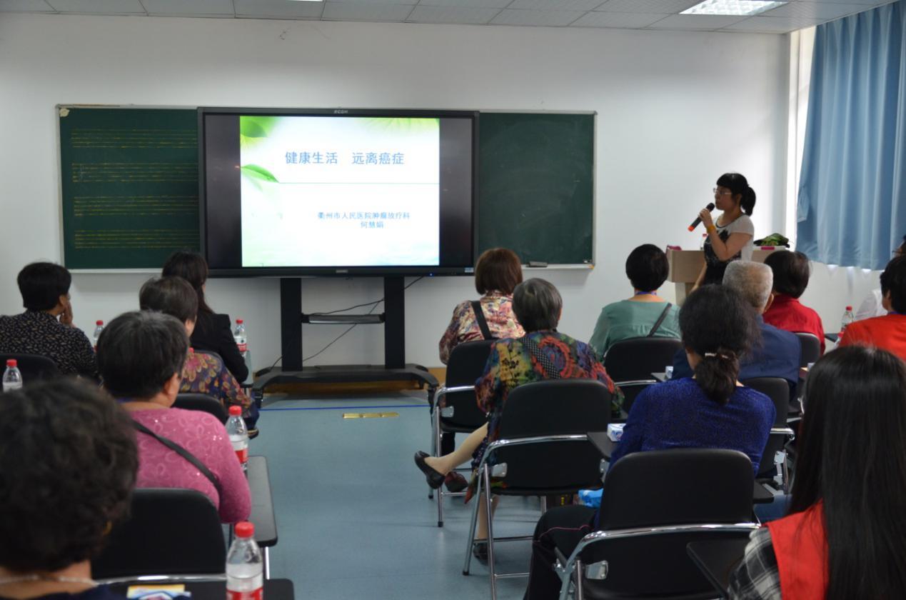 衢州市人民医院肿瘤放疗科主任何慧娟受邀为社区居民们讲授肿瘤预防讲座。何主任结合图文并茂的PPT,向在座的社区居民们介绍了肿瘤疾病概况、肿瘤自查方法,以及防癌食疗知识。