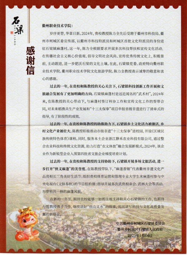 日前,我校收到了柯城区石梁镇人民政府发来的感谢信。信中,石梁镇党委、政府对我校、文化旅游学院以及衢州市科技特派员、柯城区文化特派员陈力全教授一年来对石梁镇麻蓬村的科技帮扶和文化宣传等方面提供的帮助表达了肯定和感谢,希望在未来的一年继续深入合作,共同谱写科技和文化高质量发展的新篇章。