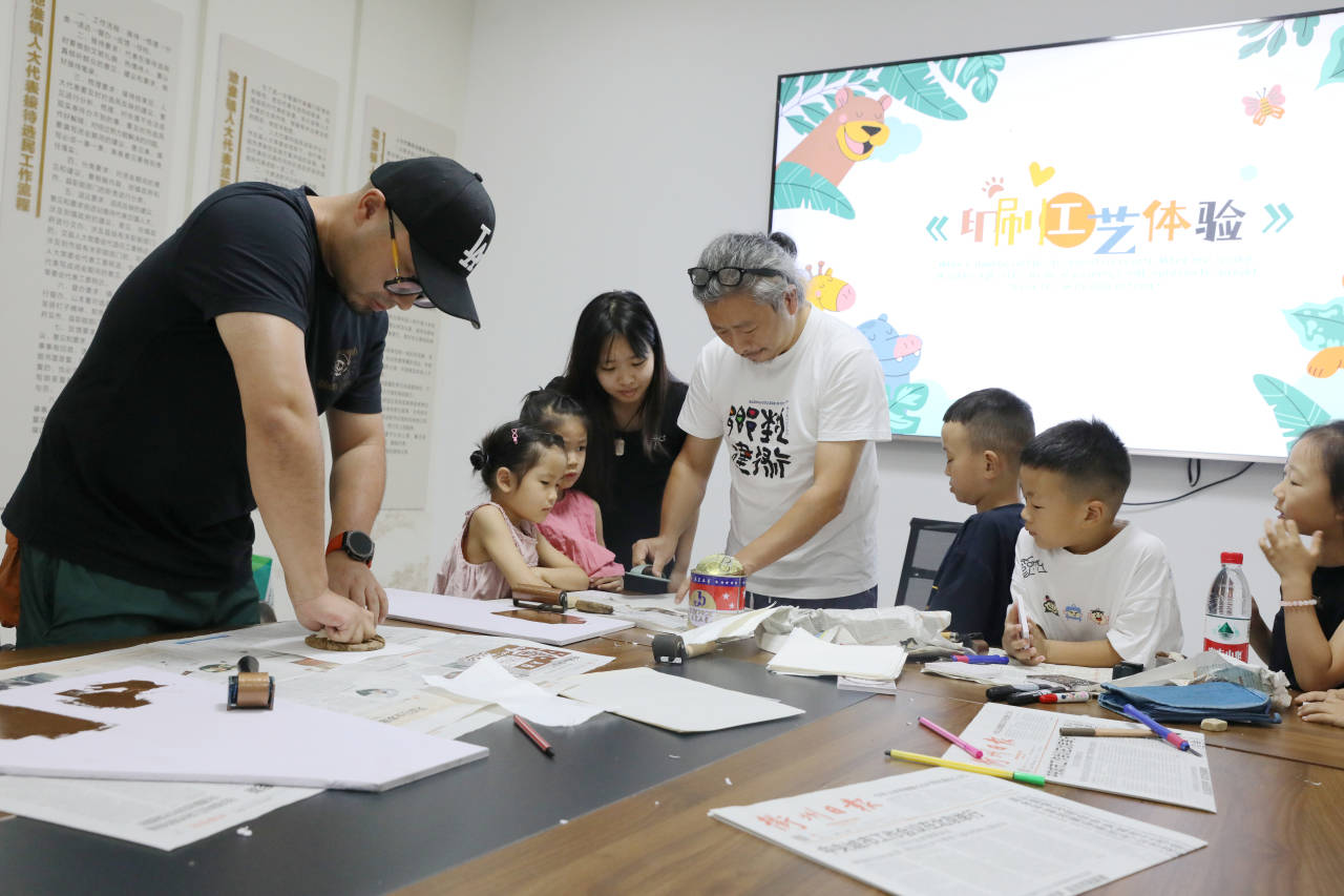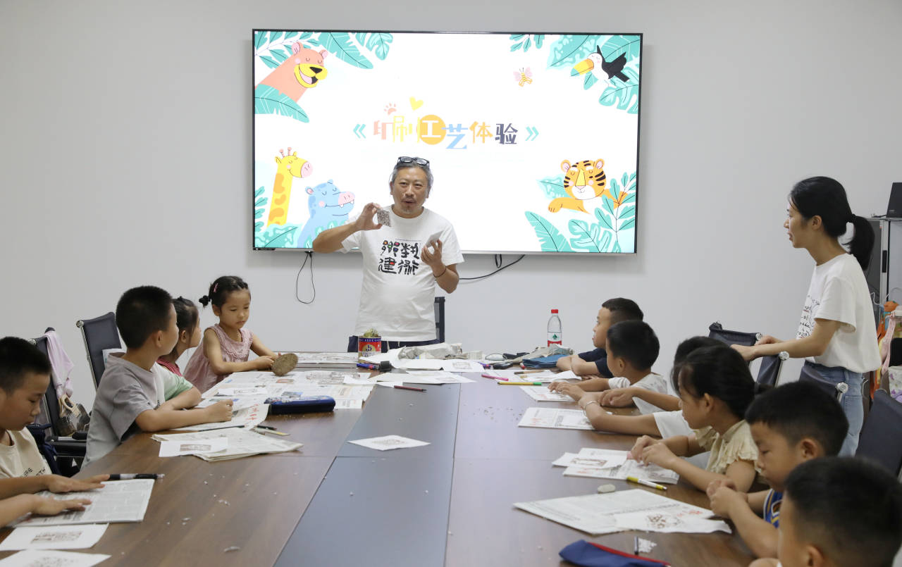 衢职院副教授、派驻开化县池淮镇池淮村农村指导员王志煊(左)带孩子们体验印刷工艺