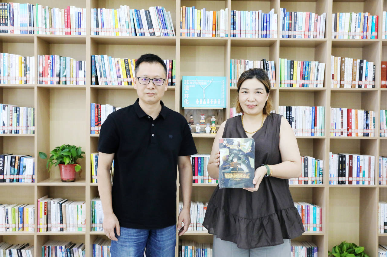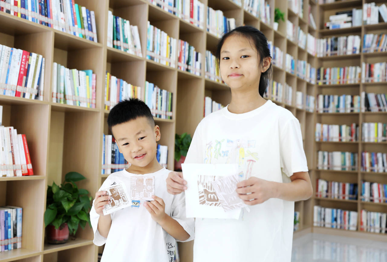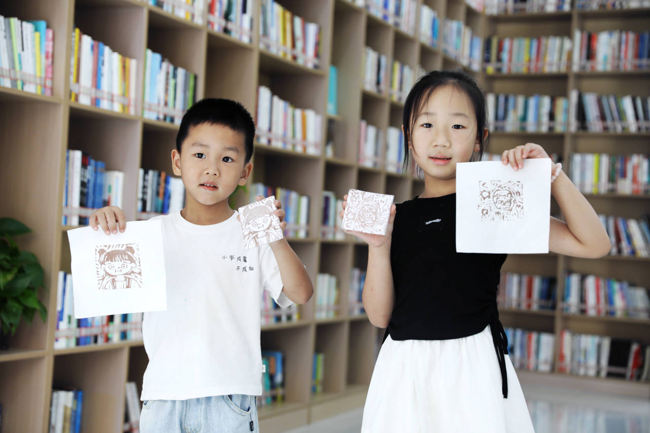 两名孩子展示自己制作的哪吒、敖丙雕版作品