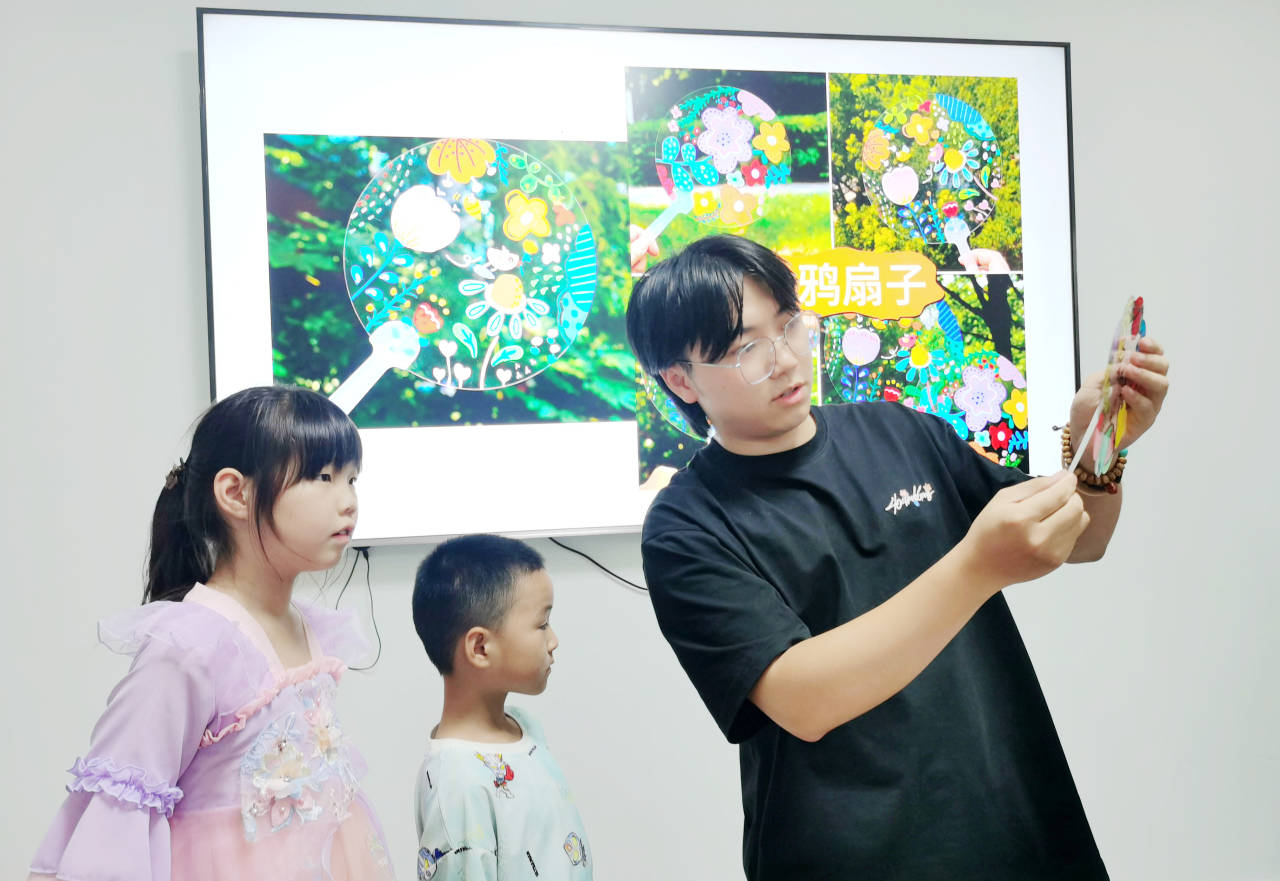 7月22日是二十四节气大暑,大学生志愿者带着孩子们制作节气主题书签。