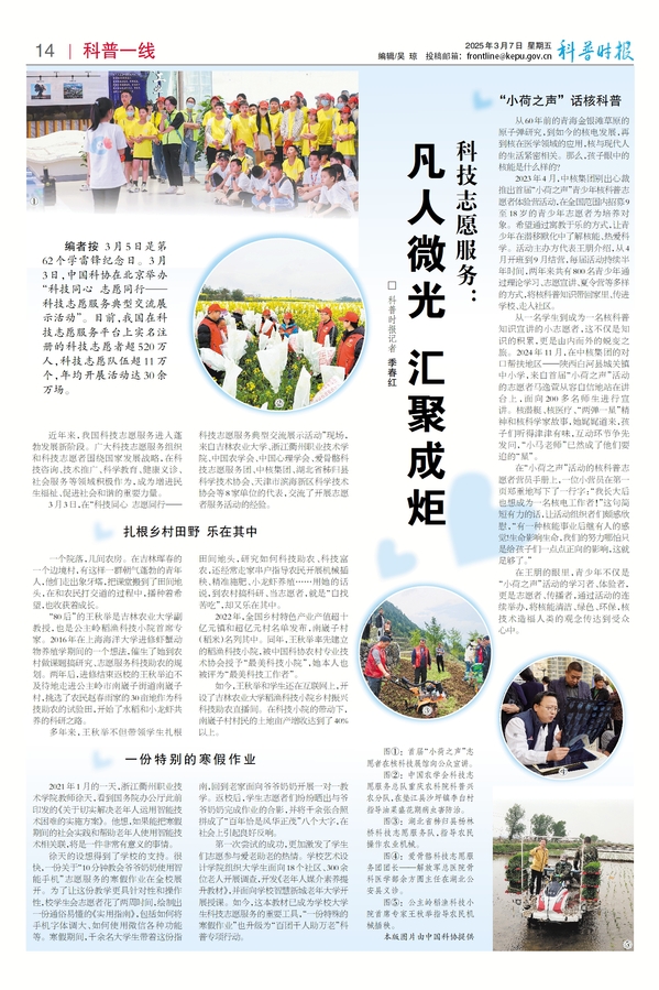 编者按 3月5日是第62个学雷锋纪念日。3月3日,中国科协在北京举办“科技同心 志愿同行——科技志愿服务典型交流展示活动”。目前,我国在科技志愿服务平台上实名注册的科技志愿者超520万人,科技志愿队伍超11万个,年均开展活动达30余万场。