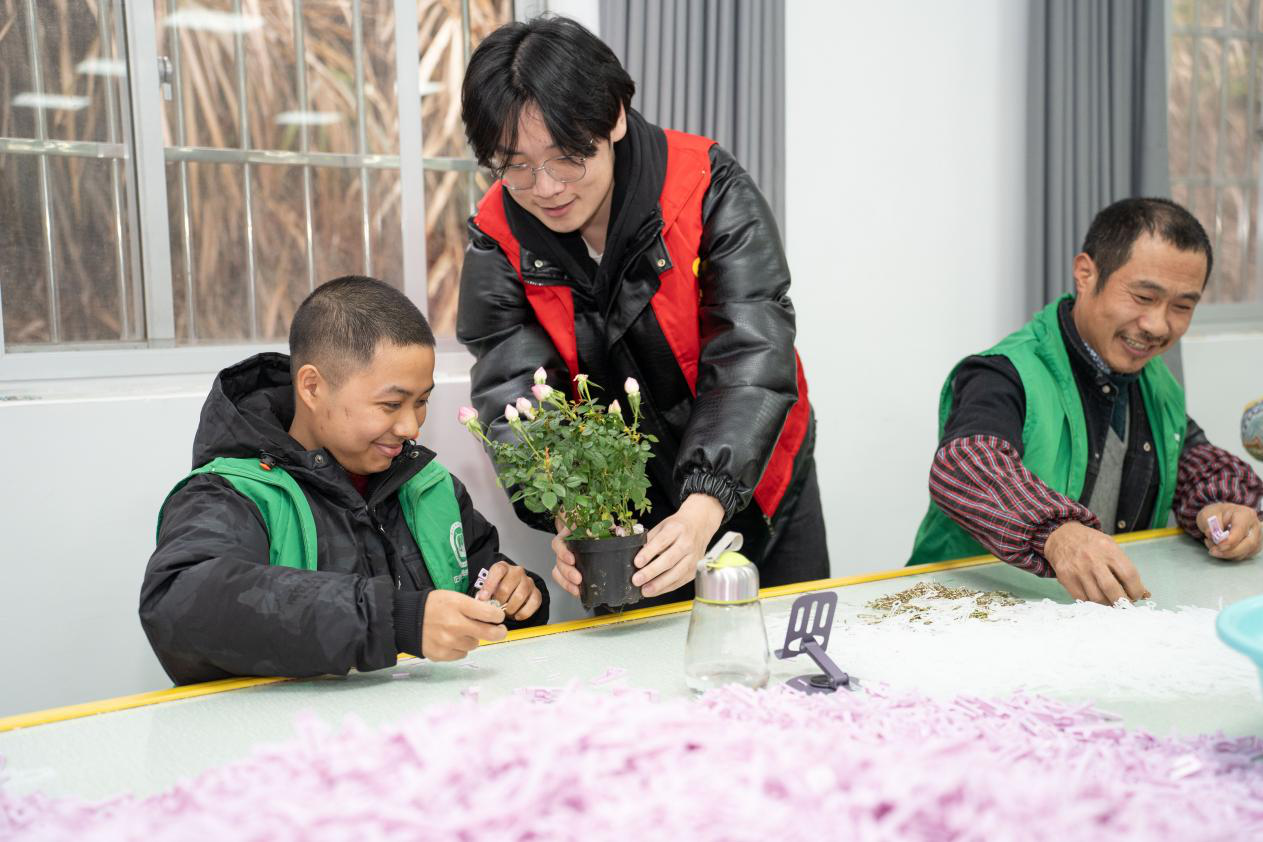 活动当天,衢职院机电工程学院的师生们带着满满的热忱与爱心,踏入了开化县长虹乡残疾人之家的大门。在互动环节开展前,残疾人之家负责人宋莉莉引领同学们参观及介绍。走进工作室,手工艺品琳琅满目。经负责人介绍,残障朋友通过制作手工艺品及线上直播方式来拓宽生活的边界。