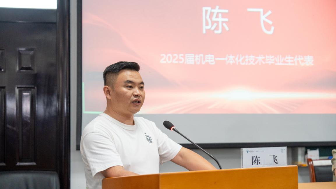 校本部机电一体化技术专业2025届陈飞同学作为毕业生代表发言,他深情回顾了在校学习期间的成长经历,表达了对母校和师长的感激之情,表示将在这段学习过程中养成的良好习惯,融入今后的生活与工作,持续巩固旧知、探索新知,为所在公司发展贡献更大的力量。
