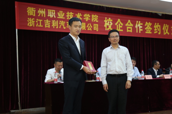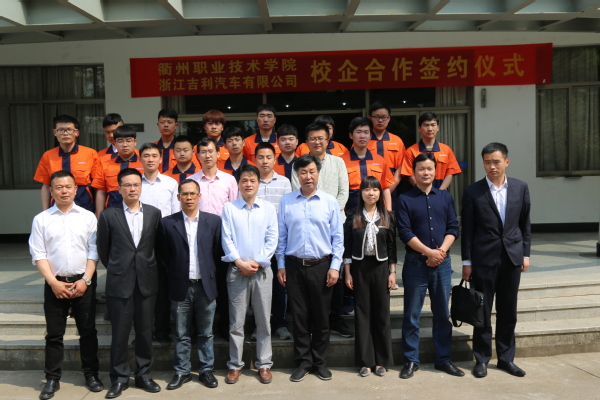 学校领导、企业代表与订单班学员合影本次校企合作签约是机电工程学院与浙江吉利汽车有限公司在经过长期接触、彼此充分了解的基础上,由校外实习基地的建立再到深度人才培养合作迈出的可喜一步-----成立吉利订单班。签约仪式开始后,陈青为仪式致辞,他强调了我校重新独立办学以来一贯坚持的两个办学理念,一是坚持“俯身贴地,提升能力,服务衢州地方经济”的发展理念,二是坚持“工学结合、校企合作、产教融合、知行合一”的育人理念。提出校企合作双方要共同努力建成联合培养人才、共同开发课程、共建实训基地、合作技术研发等长效合作机制的希望和要求。