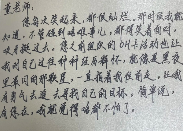 最近,我在期末感恩活动中收到了一张“悄悄话”卡,内心充盈着感动。今年,是我工作的第五个年头。五年来,我始终投身于自己所热爱的心理工作。几乎每一天,都与学生倾心交谈,累计心理辅导时长已达2000多小时。我组织了100多场心理团辅活动,其中,特色的OH卡自我探索活动帮助同学们深入了解自我,而解忧杂货铺活动引导同学们匿名倾诉内心的话语。此外,我还连续四年开设恋爱心理学选修课,每年选课人数都逾百人,深受同学们的喜爱与欢迎。