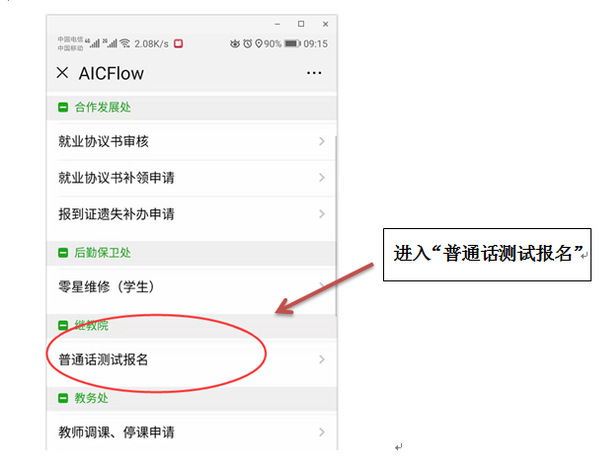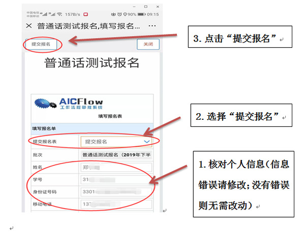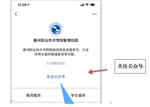 扫描二维码,关注“衢州职业技术学院智慧校园”公众号——通过 “学生服务”进入系统(账号为本人学号,密码为学号加字母a)——选择“网上办事大厅”——进入“普通话测试报名”——核对个人信息(如有错误,请修改),确认无误后选择“提交报名”——报名完成。(图示如下:)