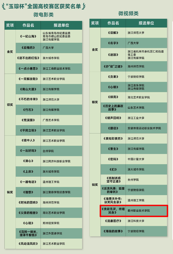 6月11日,第六届“玉琮杯”清廉微电影微视频大赛评选结果揭晓。由校纪委与艺术设计学院精心创作的《贪欲无厌,终噬其身》微视频脱颖而出,斩获全国高校赛区微视频类铜奖,实现了该项赛事奖项突破,彰显了学校近年在廉洁文化教育与艺术创作领域的显著成效。