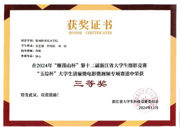 本届大赛于2024年8月启动,以“光影@廉映于心”为主题,其中高校赛区共收到128所高校的724部作品。浙江省内高校赛区作品通过浙江省大学生摄影竞赛专项赛通道选拔,晋级国赛,竞争异常激烈。在校纪委悉心指导下,艺术设计学院何敬老师带领学生团队深入挖掘清廉内核,紧密结合高校特点,以创新思维打磨作品。周梦婷、余佳创作的《贪欲无厌,终噬其身》与张艺婕、程筠淇、刘一磊创作的《缚心》,在第十二届浙江省大学生摄影竞赛“玉琮杯”大学生清廉微电影微视频专项赛中,分别荣获一等奖、三等奖,成功晋级国赛。其中,《贪欲无厌,终噬其身》凭借深刻的主题立意、精湛的镜头语言,在众多优秀作品中突出重围,最终斩获全国高校赛区铜奖。