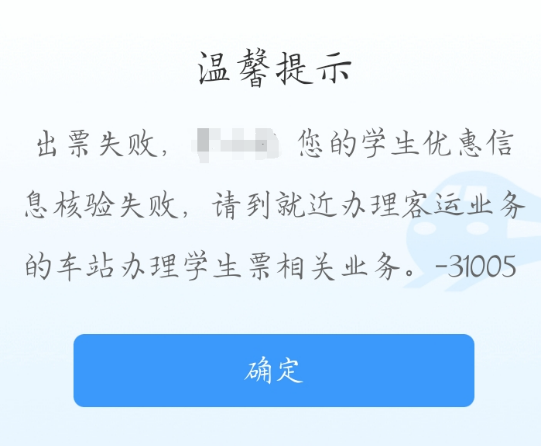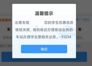当学生买票在12306买票时提示优惠信息核验失败时(如下图3、图4所示),请学生在资质查询里仔细核查所绑定的优惠区间(如图1所示)是否是正确的站点名称,若发现绑定站点不正确或与实际乘车区间(学校--家庭)不符时,请尽快找教务处226吕菲老师修改优惠卡内站名名称,然后去车站自助机刷身份证、优惠卡重新绑定资质信息,重新绑定资质以后12306上资质信息区间修改成功后才可以买票!