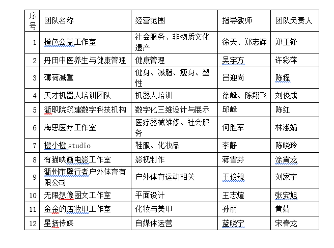根据《衢州职业技术学院大学生创业园管理办法(修订)》、《关于开展大学生创业园入驻项目申报工作的通知》和《关于开展2020年度大学生创业园入驻项目评审工作的通知》,创业学院组织开展了2020年度大学生创业园入驻项目的申报和评审工作经各二级学院组织申报、专家综合评审,现将拟入驻大学生创业园的项目进行公示。公示时间2020年11月2日-11月4日,共3天,联系电话:8069123(傅老师)。