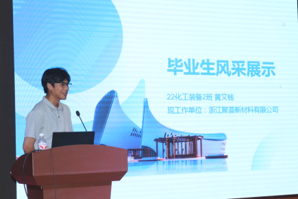 我院优秀校友黄文钱同学(现就业单位:浙江聚荟新材料有限公司),分享了自己在校期间参与班级治理、党团活动、科技竞赛、留衢高质量就业的实践经验;另一位优秀校友钟勤杰同学(现就业单位:衢州市消防救援支队柯山大队)分享了从一名化工装备专业学子成长为一名应急救援卫士的心路历程。