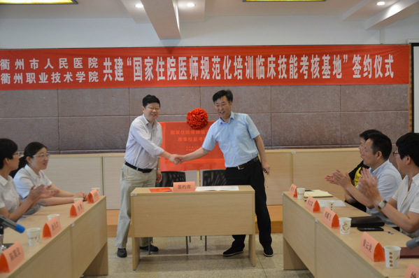 衢州市人民医院陈震宏院长代表医院全体职工,表示非常荣幸能参加本次签约和揭牌仪式,并对各位与会的校方领导表示衷心感谢。陈震宏院介绍了市人民医院医教合作、专业建设、人才梯队等概况,并指出,医改关键在人才,人才关键在培训,只有不断加强培训、考核,才能有效提升医护人员的医疗技术水平,从而满足近年来我市人民对医疗、医务工作者不断提升的要求和期望值。本次与衢职院共建国家住院医师规范化培训临床技能考核基地,必将助推衢州市医疗卫生事业的发展越来越好!