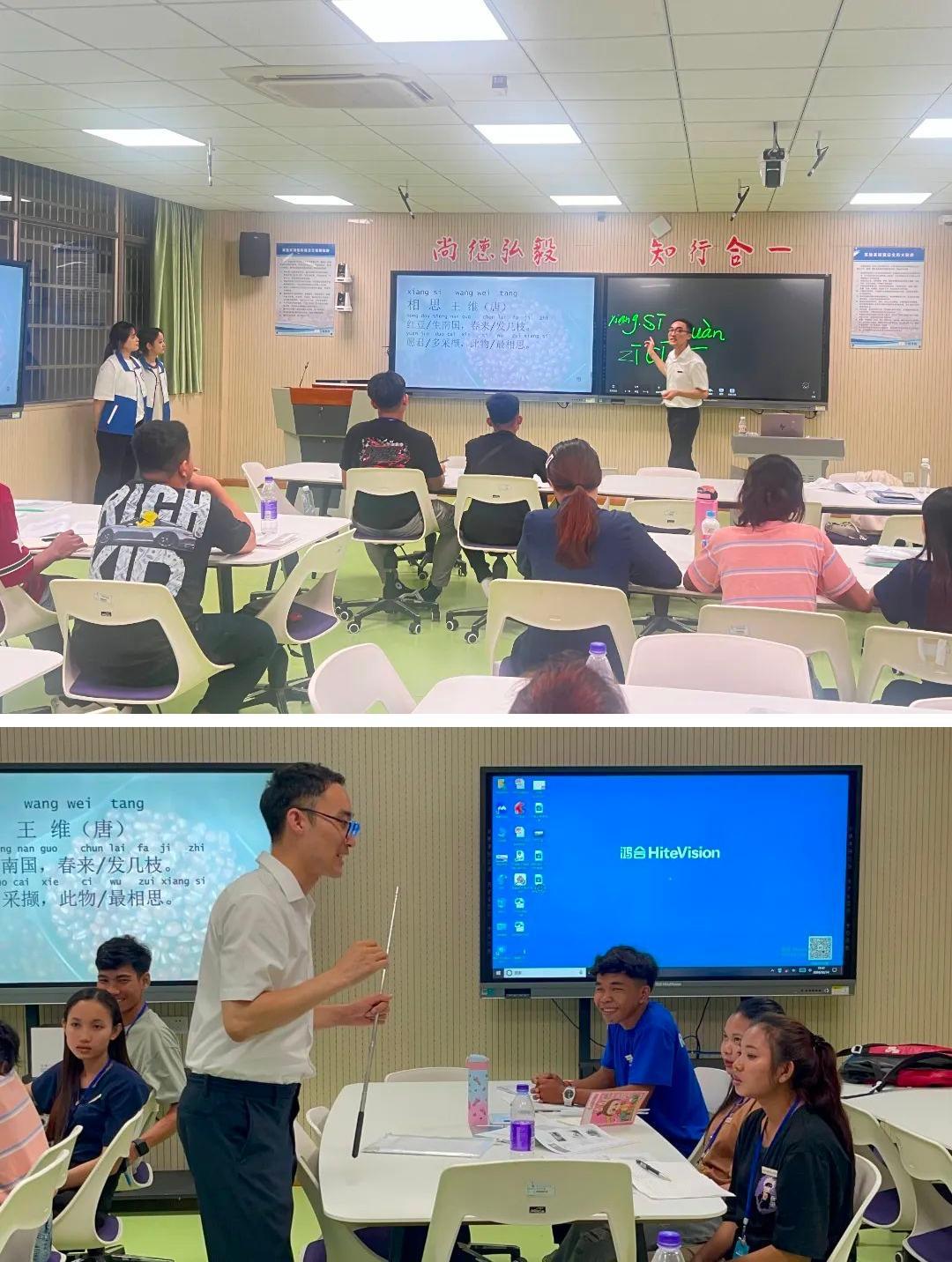 课堂上,韩瑞鑫老师以《相思》一诗为引,开启柬埔寨留学生的中文学习之旅。“红豆生南国,春来发几枝……”这首诗以“红豆”为载体,跨越时空地传达出留学生身处异乡思念亲人的情感。这不仅是柬埔寨学子对汉语诗词之美的初步探索,感受中国文化重视人际关系和情感沟通的核心价值,更是对他们情感世界的轻柔触碰,引发情感共鸣,从而拉近他们与中文的距离,为日后的中文学习体验奠定了良好基础。