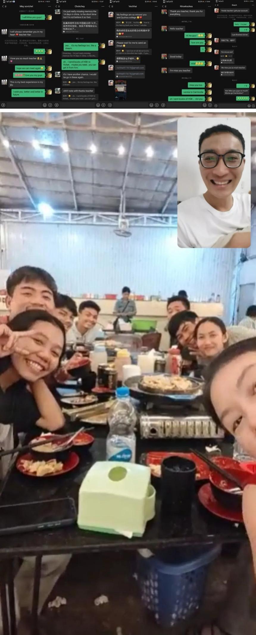 这是衢州职业技术学院柬埔寨留学生Chokchey和Sokea给韩瑞鑫老师发来的微信消息及其他同学打来的视频电话。时至今日,转眼间他们已经回国10天有余,虽然这些学生仅在学校学习交流了短短两周,但他们依旧通过微信、邮箱与韩老师保持着联系,时刻牵挂着中国的班主任“大哥哥”,延续着这份跨越时空的中柬友谊。这份珍贵的友谊缘起于2023年8月,发生于2024年10月13日至27日。