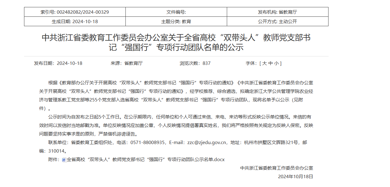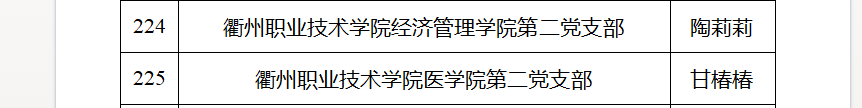 近日,中共浙江省委教育工作委员会办公室对入选全省高校“双带头人”教师党支部书记“强国行”专项行动团队的名单进行了公示,衢州职业技术学院经济管理学院第二党支部、医学院第二党支部等2个党支部同时入选。