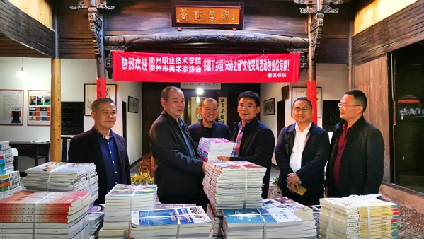 11月9日,衢州职业技术学院书画协会和衢州市美协书画家来到常山县招贤镇高埂村箬溪自然村,参加“宋词之河”采风活动,并捐赠图书300多册。